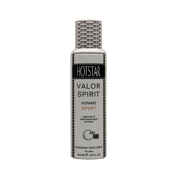 اسپری مردانه هات استار (Hotstar) مدل آلور هوم اسپرت (Valor Spirit) فراتر از یک اسپری عمل می کند با بیش از 48 ساعت ماندگاری. این محصول رایحه ای شبیه عطر CHANEL – Allure Homme Sport شنل آلور هوم اسپرت دارد.
