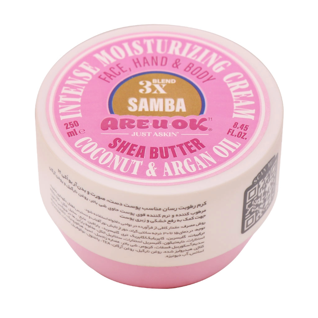 کرم مرطوبکننده آر یو اوکی، مدل samba، مناسب انواع پوست، حاوی شیباتر، روغنهای نارگیل و آرگان، نرمکننده، مناسب استفاده برای دست، صورت و بدن، حجم 250 میلیلیتر
